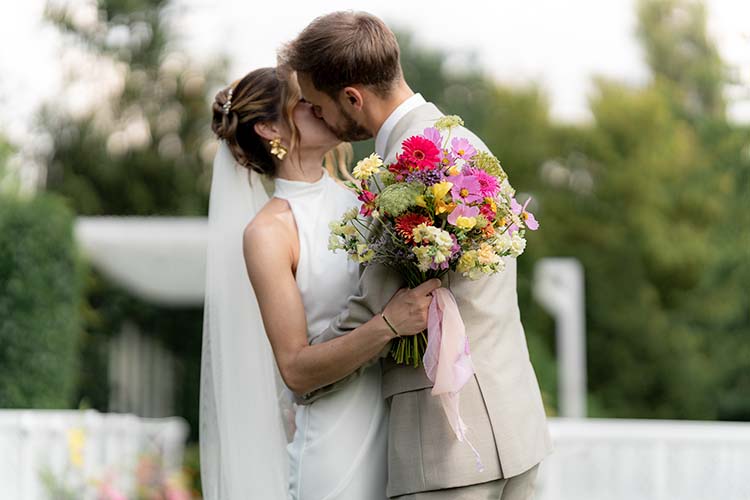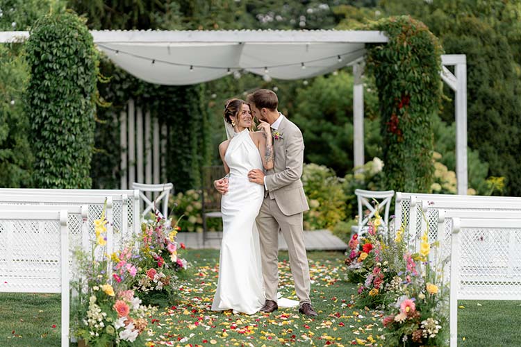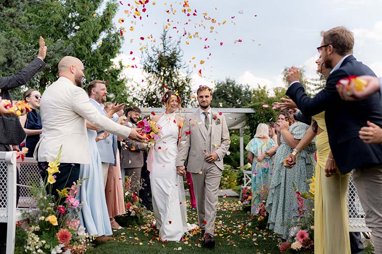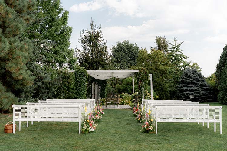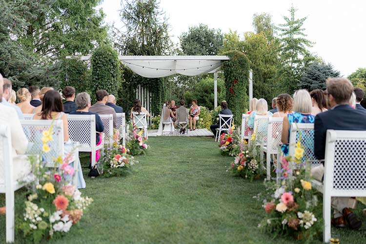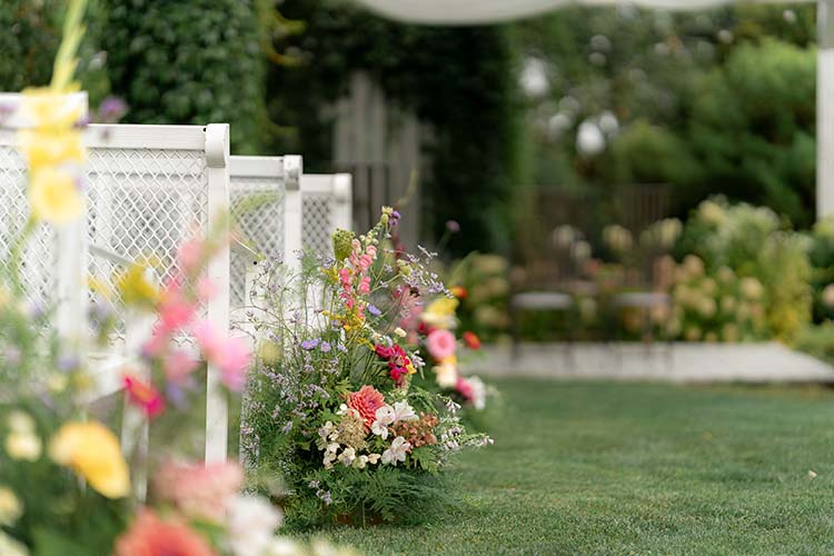 Wzdłuż alejki prowadzącej do miejsca ceremonii ustawiliśmy dekoracje pełne kolorowych kwiatów. Kompozycje wyróżniały się krętymi i fantazyjnymi liniami wprowadzającymi lekkość. Zarys kompozycji był naturalny, a kwiaty w nasyconych barwach zostały pięknie wyeksponowane na szmaragdowej zieleni trawy. Płatki kwiatów rozsypane po ceremonii nawiązywały do kolorowych kompozycji, a całość prezentowała się swobodnie i uroczo.