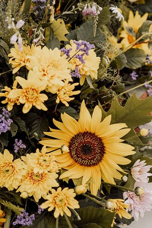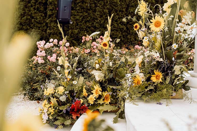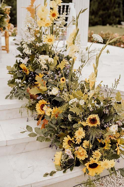 W dekoracji altany żółte słoneczniki zostały umieszczone w kompozycjach na schodach tworząc słonecznikową alejkę. Towarzystwo pozostałych kwiatów, takich jak ostróżki, dalie, firletki, kosmosy, mieczyki i limonium w odcieniach bieli oraz lawendowym subtelnie harmonizowało z kolorem żółtym tworząc swobodną dekorację w charakterze łąki kwietnej.
