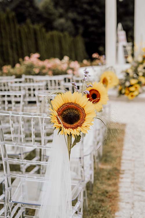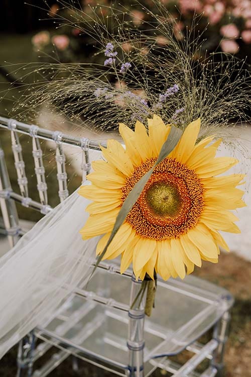 Słoneczniki znalazły się również w dekoracji krzeseł dla gości, tworząc kontynuację aleji słonecznikowej. Subtelne tiule w kolorze śmietankowym tworzyły uroczystą atmosferę, powiewając swobodnie na wietrze. Także na krzesłach Młodej Pary umieściliśmy dekorację z motywem słoneczników.