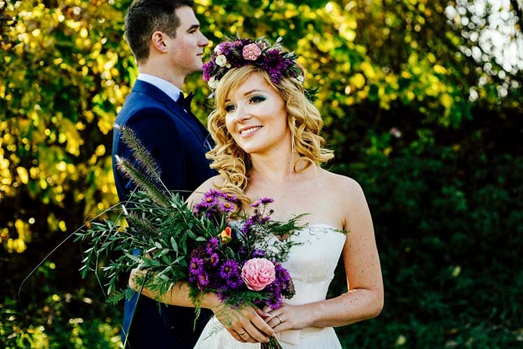 Na wrześniową sesję fotograficzną przygotowaliśmy dekoracje w stylu boho. Pani Magdalenie zależało, aby wprowadzić naturalny klimat – wraz z narzeczonym kochają góry. Bukiet w formie naręcza powstał z kwiatów sezonowych kwitnących w ogrodzie w odcieniach od pudrowego różu do ciemnego fioletu i różnorodnej zieleni, a także traw – nawiązujących do górskiej łąki. Uzupełnieniem stylizacji był wianek wykonany tradycyjną metodą wicia.