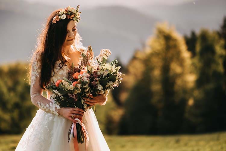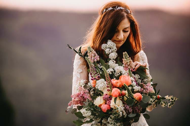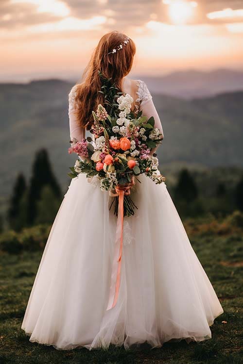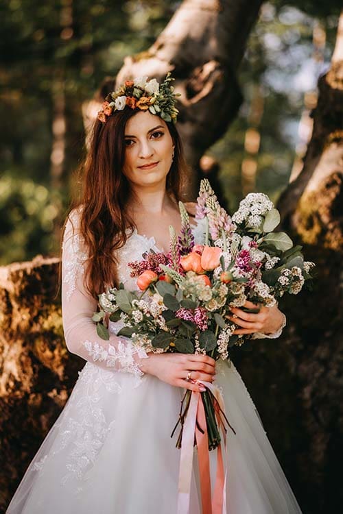 Wiosna, wschód słońca i góry to wymarzone tło do ślubnej sesji. Dla pani Aleksandry wykonaliśmy bukiet z wiosennych kwiatów i półwianek, które uzupełniały wiosenną stylizację i nadały sesji romantyczny charakter. śmietankowa koronkowa sukienka pięknie harmonizowała z naturalnymi kwiatami. Do bukietu dodaliśmy kolorowe długie wstążki nawiązujące do odcieni kwiatów.