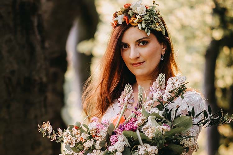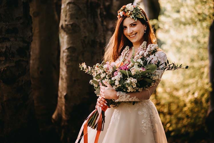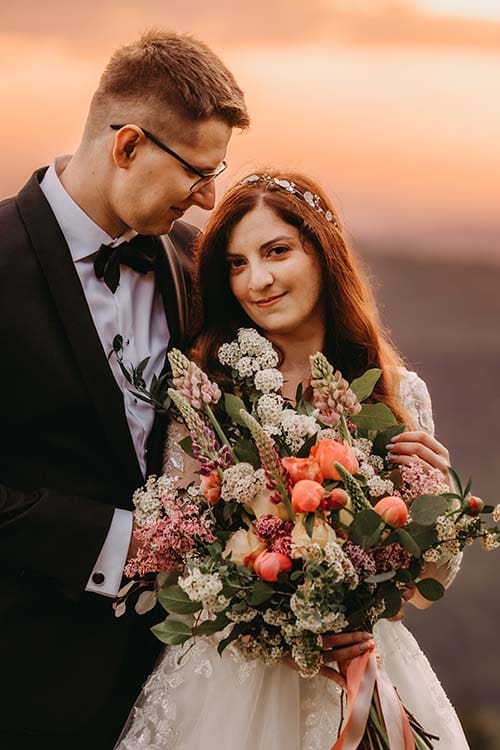 W bukiecie i wianku pojawiły się kwiaty w odcieniach koralowych, takie jak piwonia, a także łubin i bez oraz zielone gałązki eukaliptusa. Do bukietu dodaliśmy także tawułę kwitnącą na biało, która pięknie kontrastowała z ciemnymi włosami pani Aleksandry, a promienie wschodzącego słońca otuliły ciepłym światłem Młodą Parę.