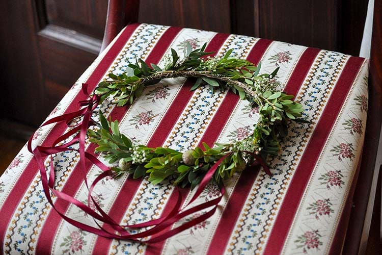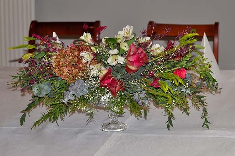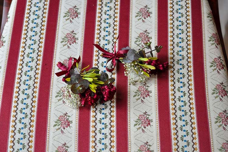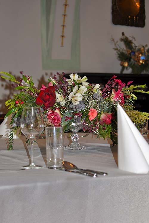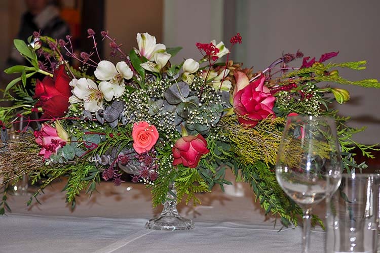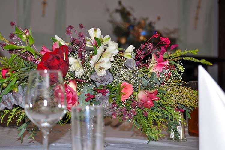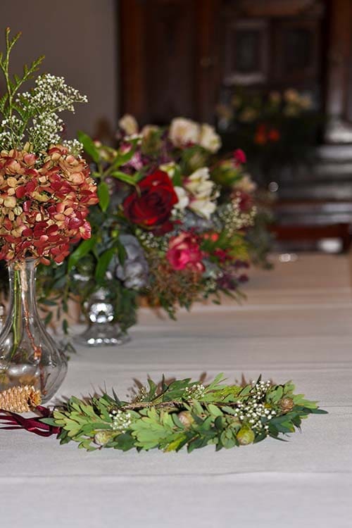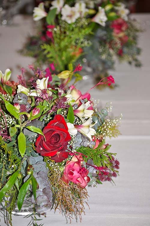 W grudniowe popołudnie delikatne płatki śniegu wirowały na wietrze, a stoły w Sali Kominkowej zostały nakryte śnieżnobiałym obrusem, na którym pojawiły się dekoracje w odcieniach ciemnej czerwieni i subtelnej bieli. Wśród kwiatów dominowały burgundowe róże otulone delikatną gipsówką, biała alstromeria oraz hortensja. Kompozycje wypełnił także srebrny eukaliptus, dekoracyjny susz i gałązki różnorodnych iglaków z szyszkami.