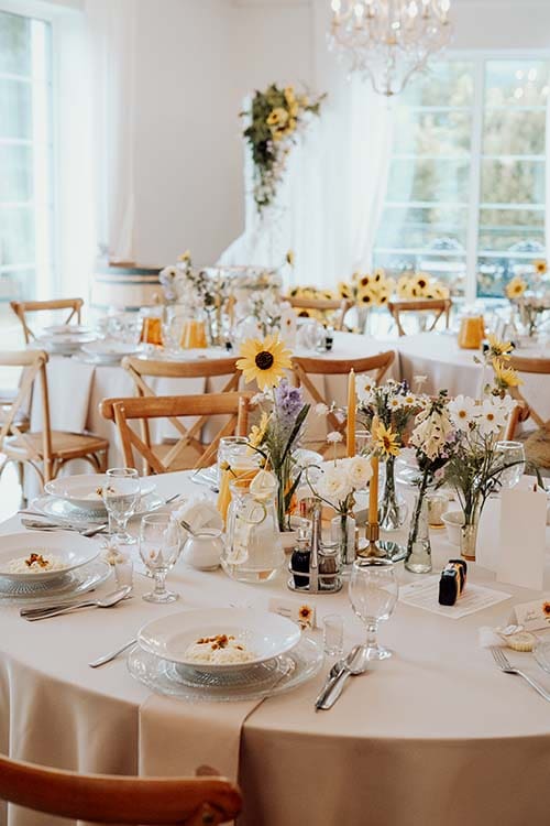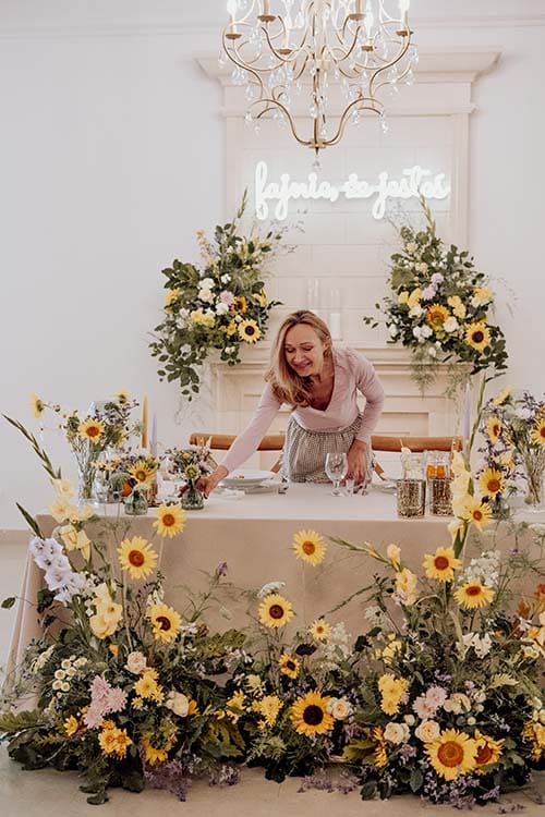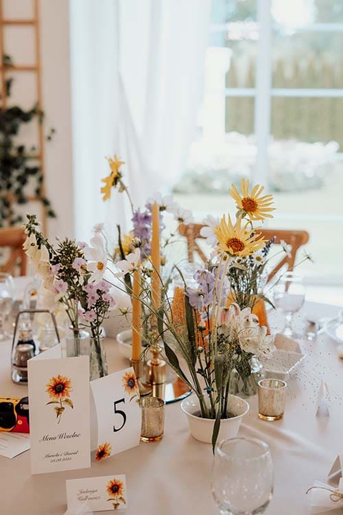 W dekoracjach na stołach żółte słoneczniki zostały umieszczone swobodnie w kenzanach, które wydobyły ich piękno. Towarzystwo pozostałych kwiatów, takich jak ostróżki, dalie, firletki, kosmosy, mieczyki, limonium w odcieniach bieli i lawendowym subtelnie harmonizowało z kolorem żółtym.