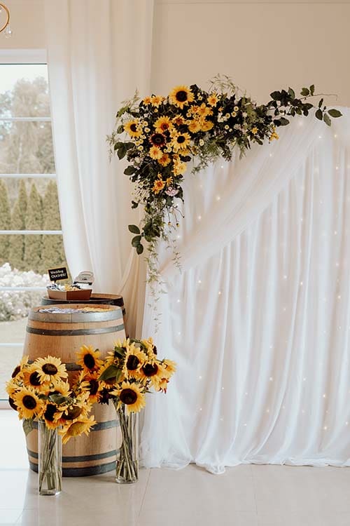 Na ściance do zdjęć także umieściliśmy dużą dekorację z motywem słoneczników, a przed ścianką stanęły słoneczniki, które były rozdawane gościom.